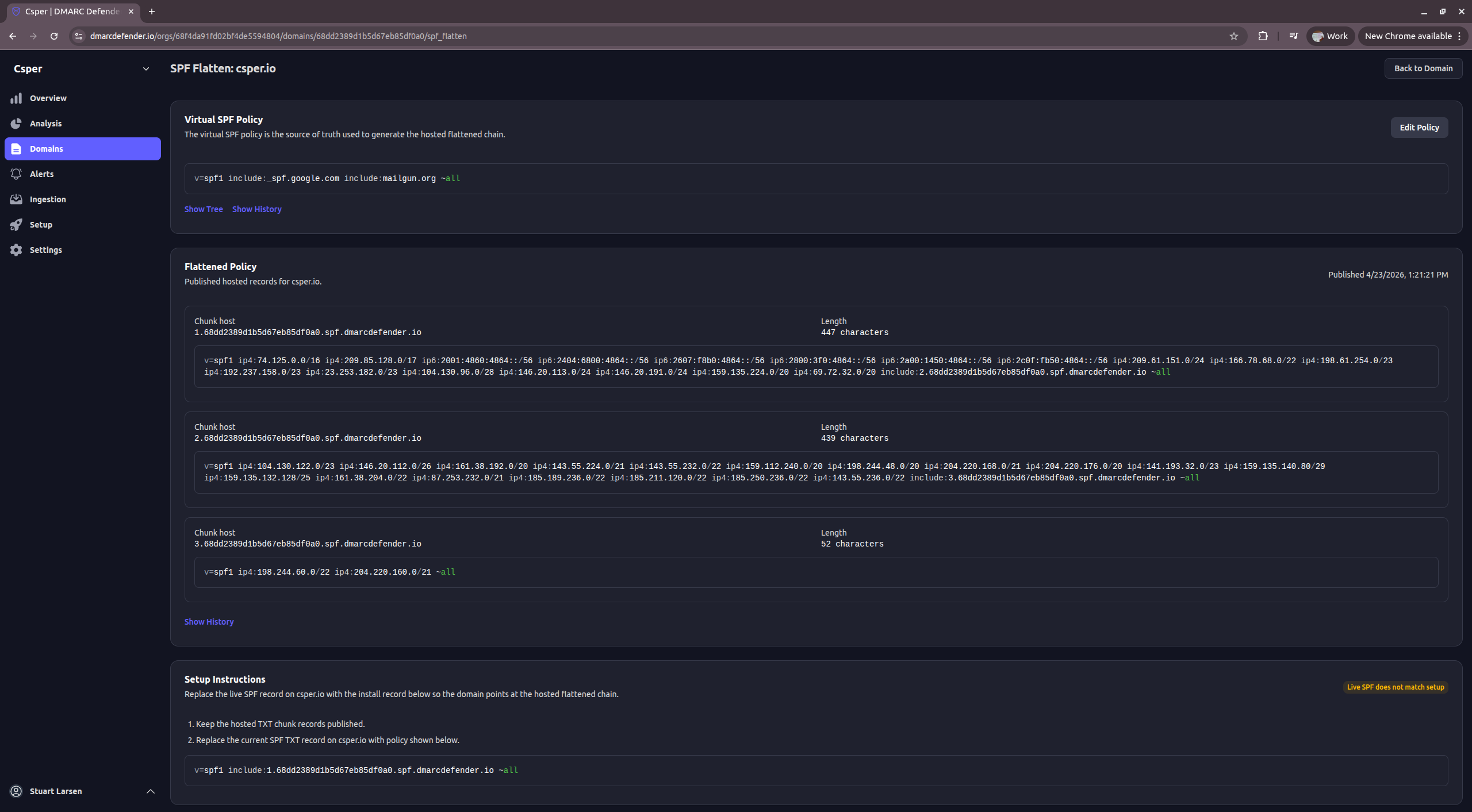 - Replace the live SPF TXT record on your domain with that install record so your SPF checks resolve through the hosted flattened chain.